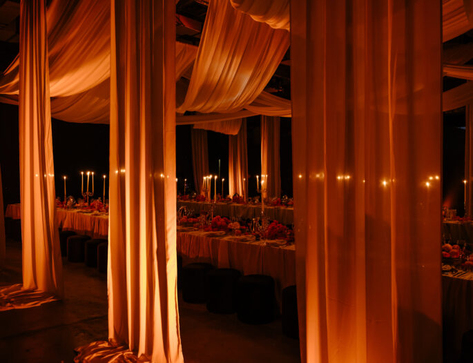 The design approach was developed to support the atmosphere envisioned for the closing dinner. Working within an existing creative space, the project responded to both the cultural context and the practical conditions of the venue. The solution took shape in dialogue with the setting, which included long textile drapes, existing artworks, and a layout that required clarity and flexibility.